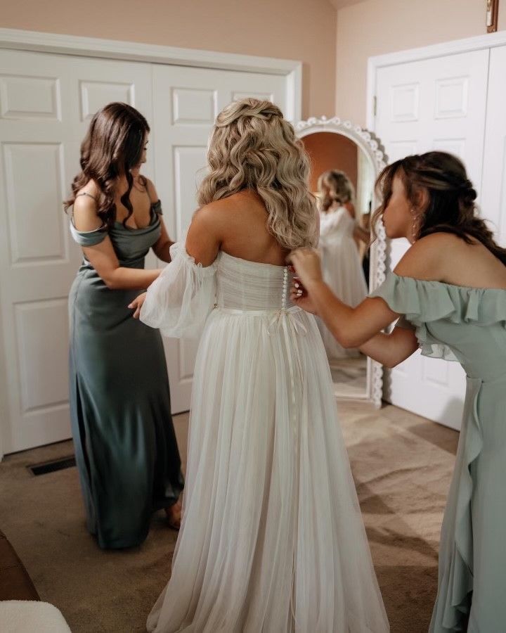 This strapless A-line tulle gown fit like a glove. Julia needed standard alterations which included a hem, bustle, cups for fit, belt attached and the removable sleeves adjusted so they’d stay in place.