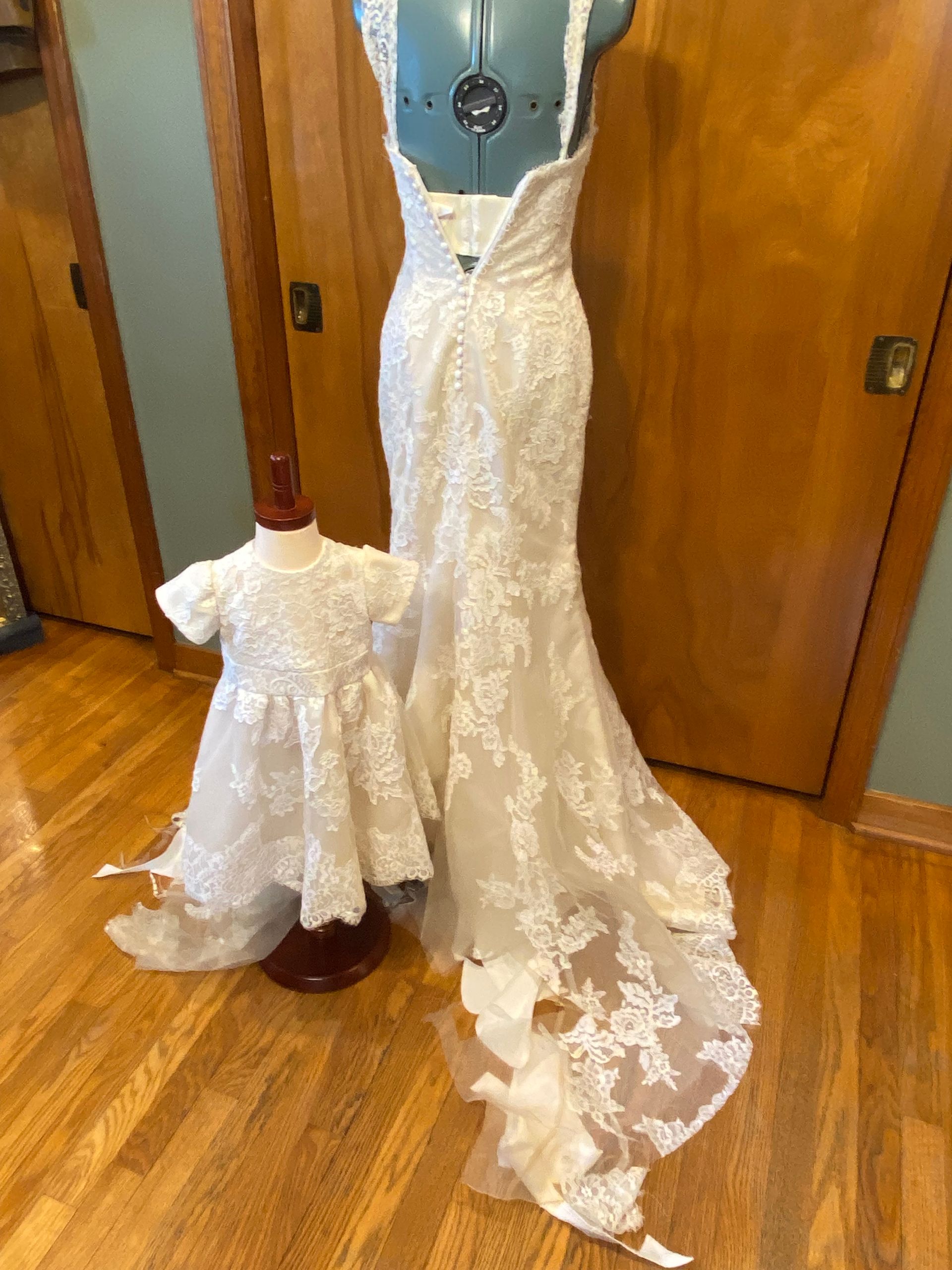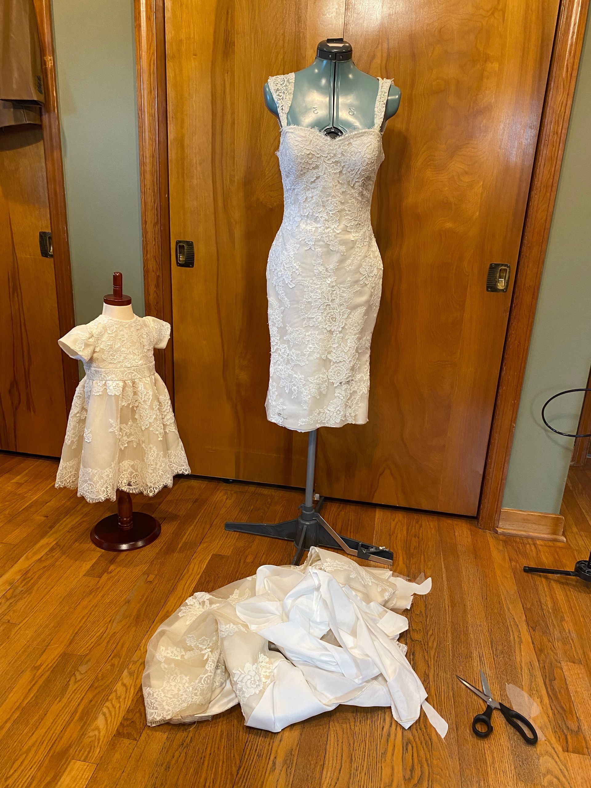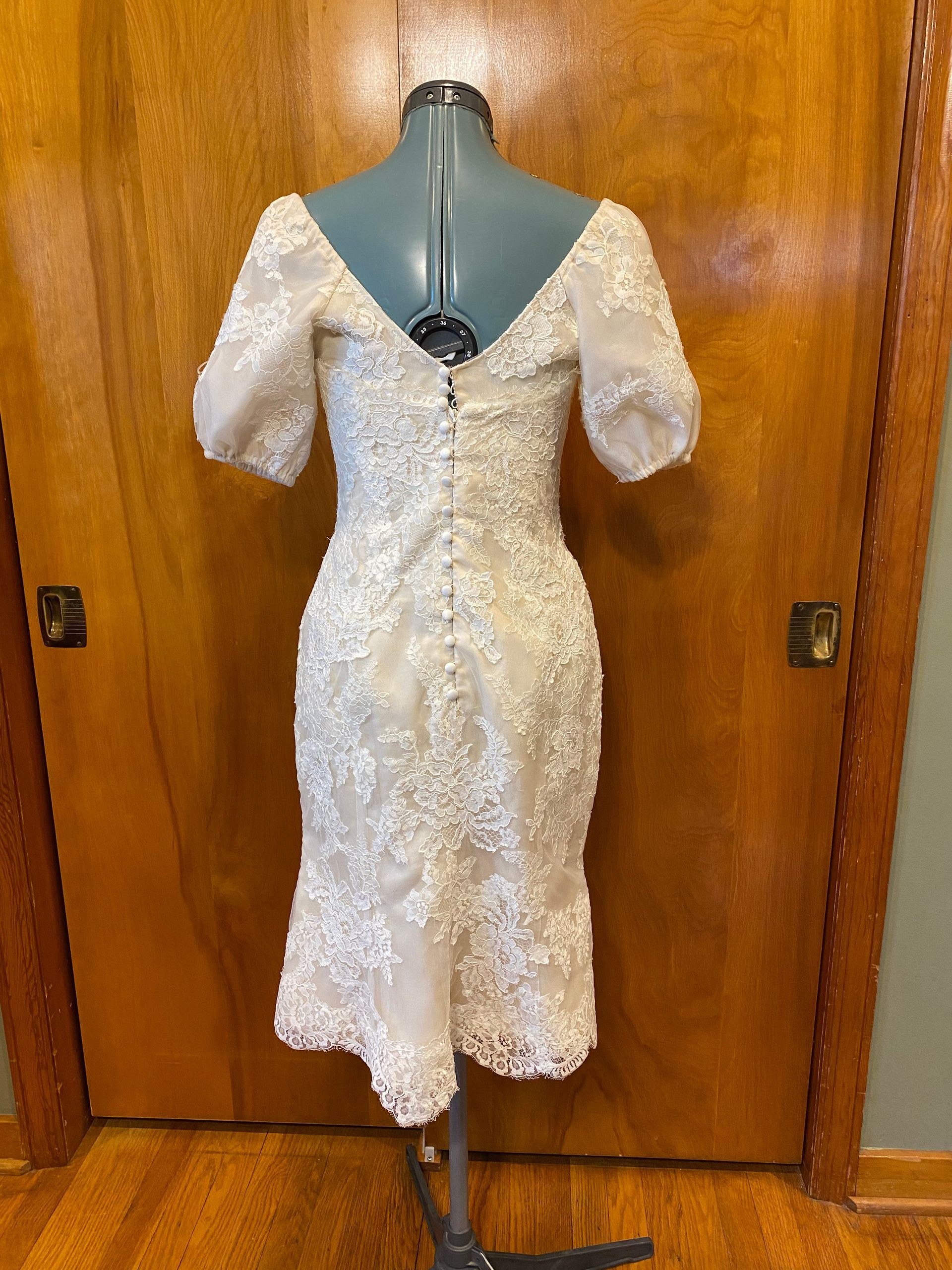 dress. I believe we accomplished that. We customized her dress by adding sleeves, raising the back up, adding a slit and replaced the lace trim.
