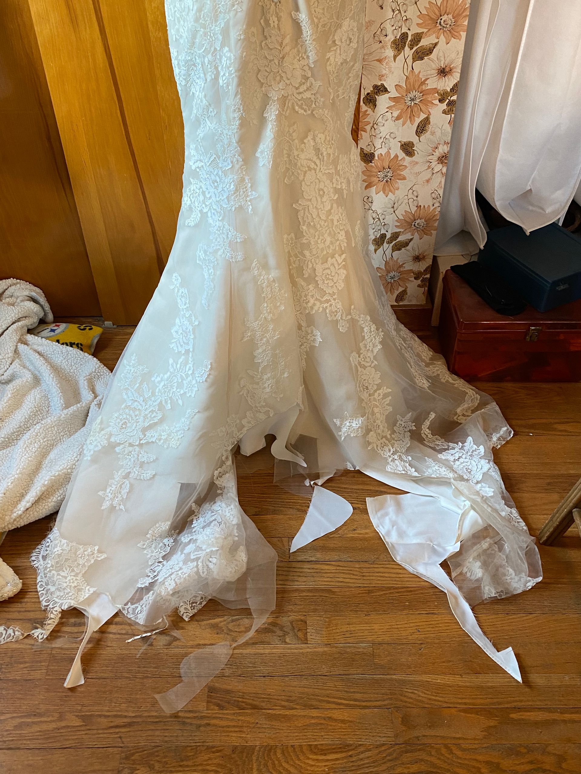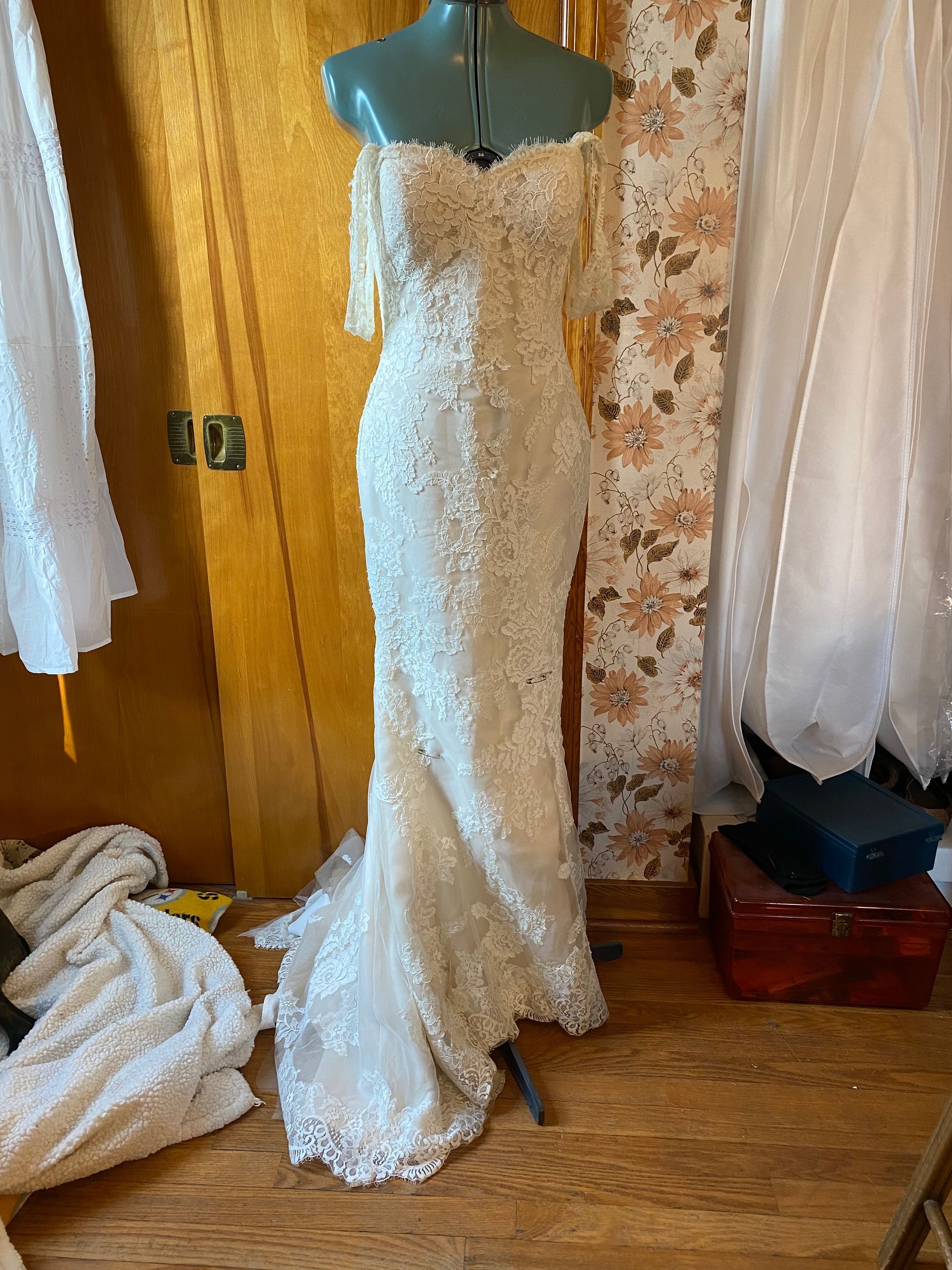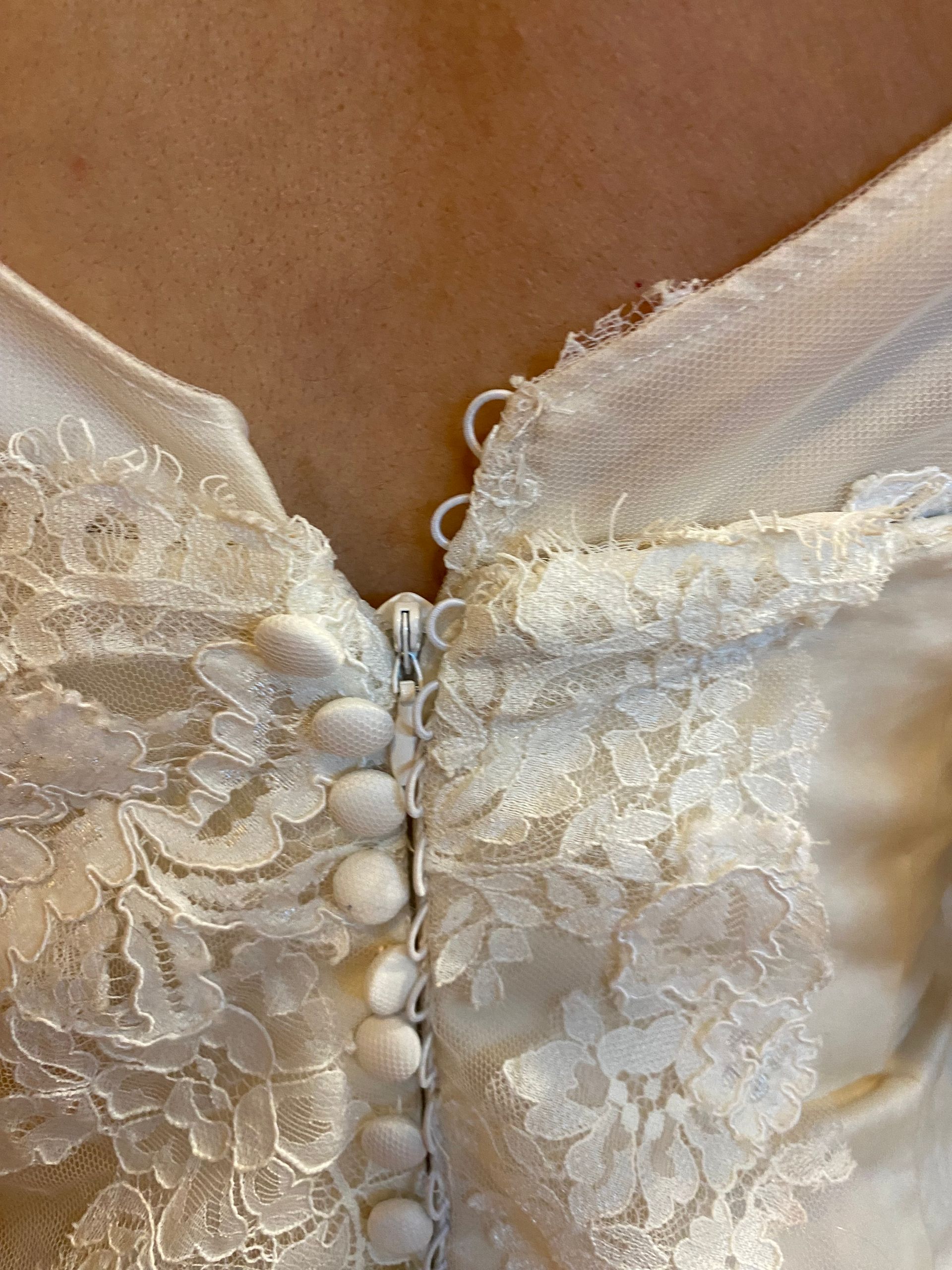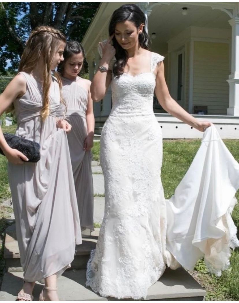 dress. I believe we accomplished that. We customized her dress by adding sleeves, raising the back up, adding a slit and replaced the lace trim.